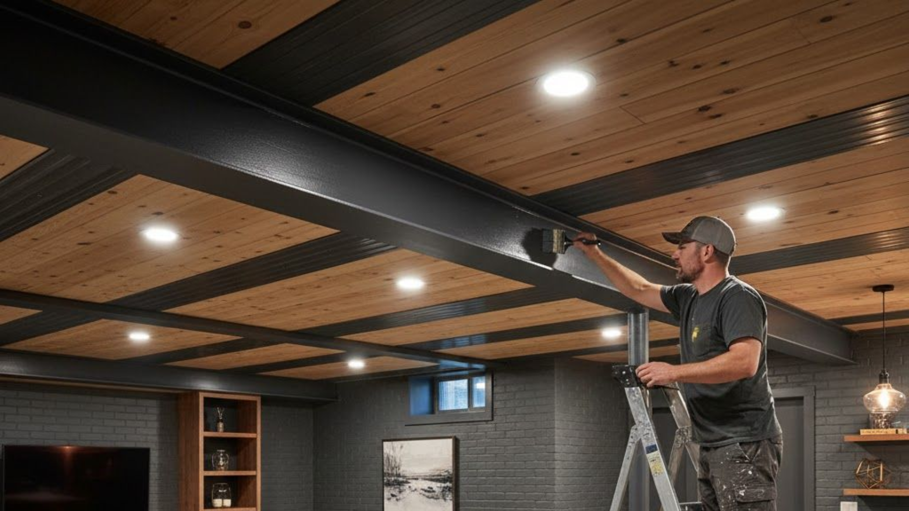 Exposed beams and columns often highlight architectural character. Wood and metal surfaces require different preparation and primers.